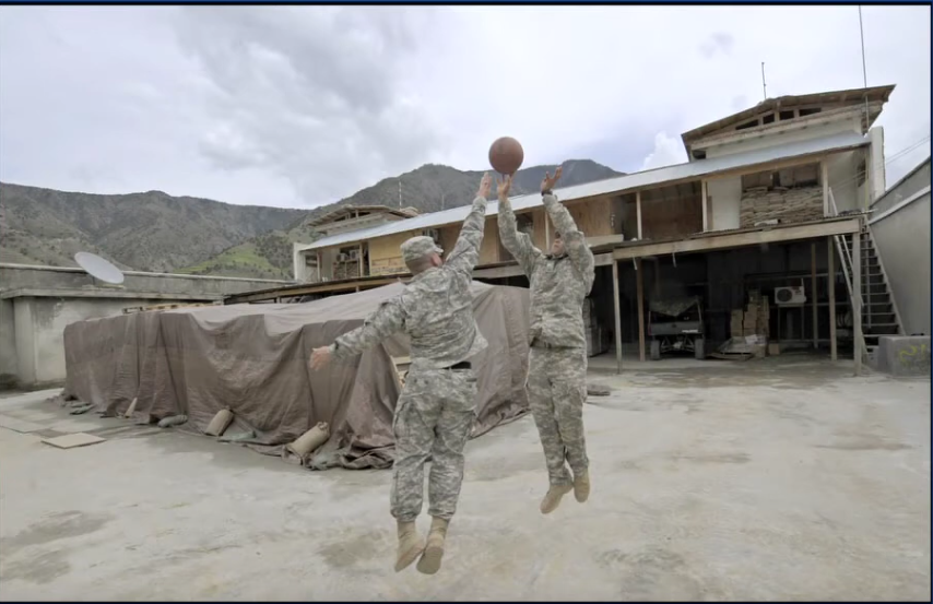 TOPSHOT - Two US soldiers from 1st Infantry Division play a game of basketball at ISAF’s Camp Bostick in Naray, in Afghanistan’s eastern Kunar province on April 16, 2009. The ISAF deployment numbers more than 58,000 troops from 42 countries, according to its latest information. It works alongside a US-led coalition that is estimated to number around 10,000 although the figure is not public. AFP PHOTO/LIU Jin (Photo by LIU JIN / AFP) (Photo by LIU JIN/AFP via Getty Images)